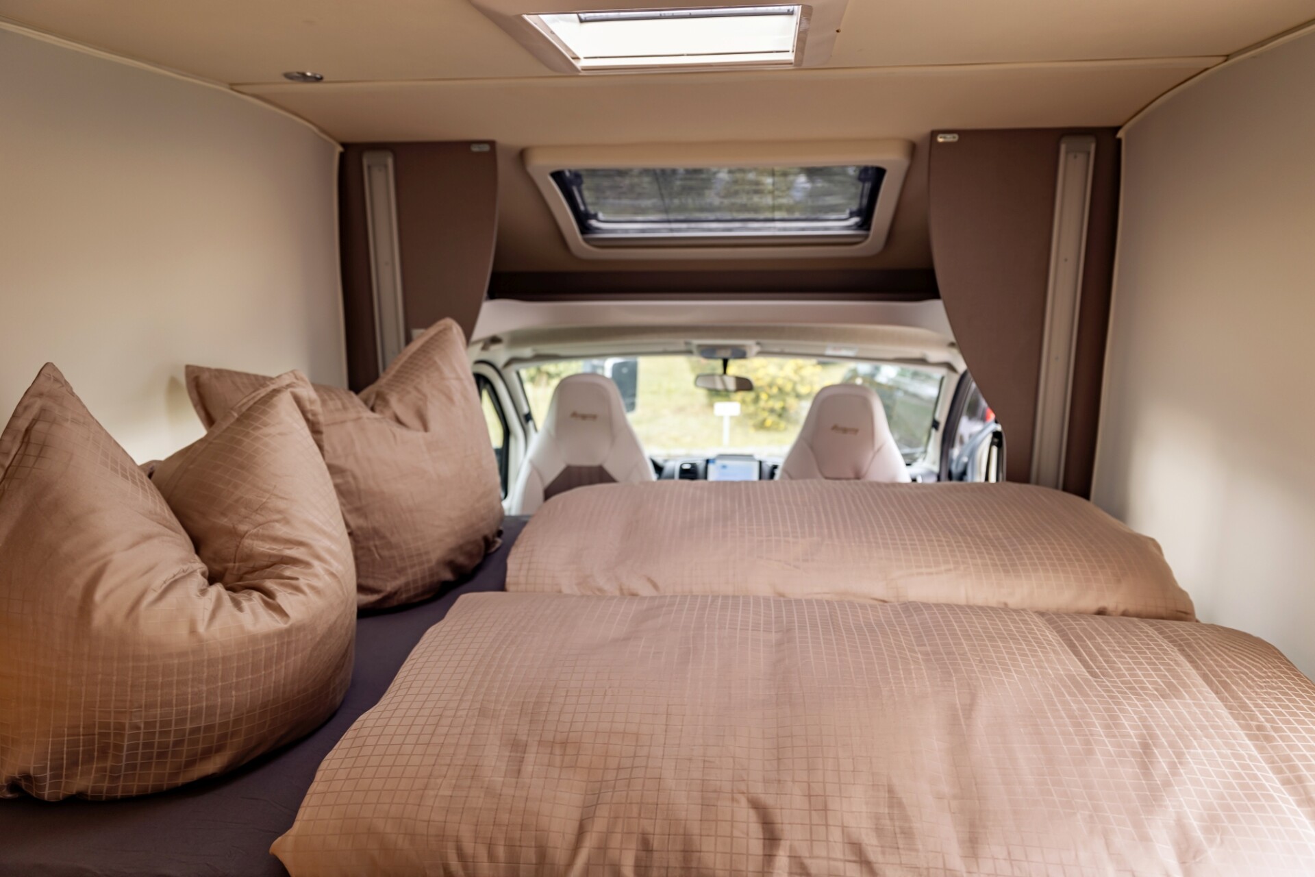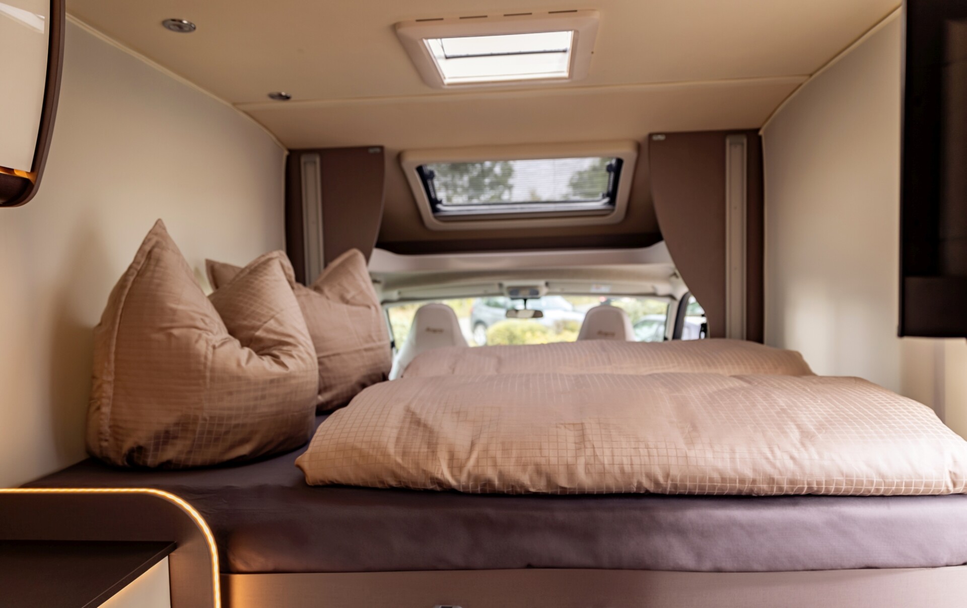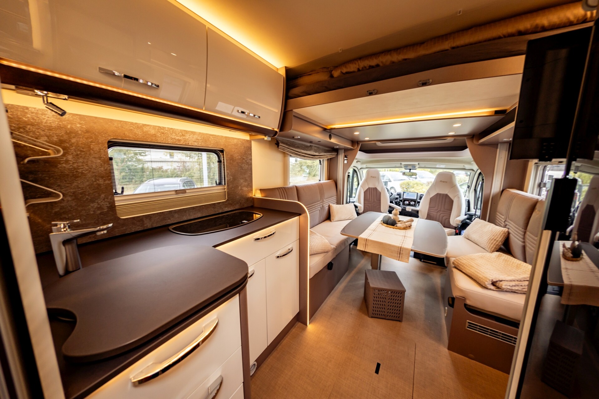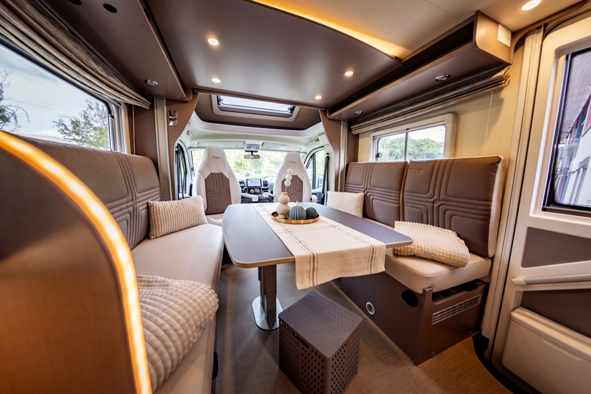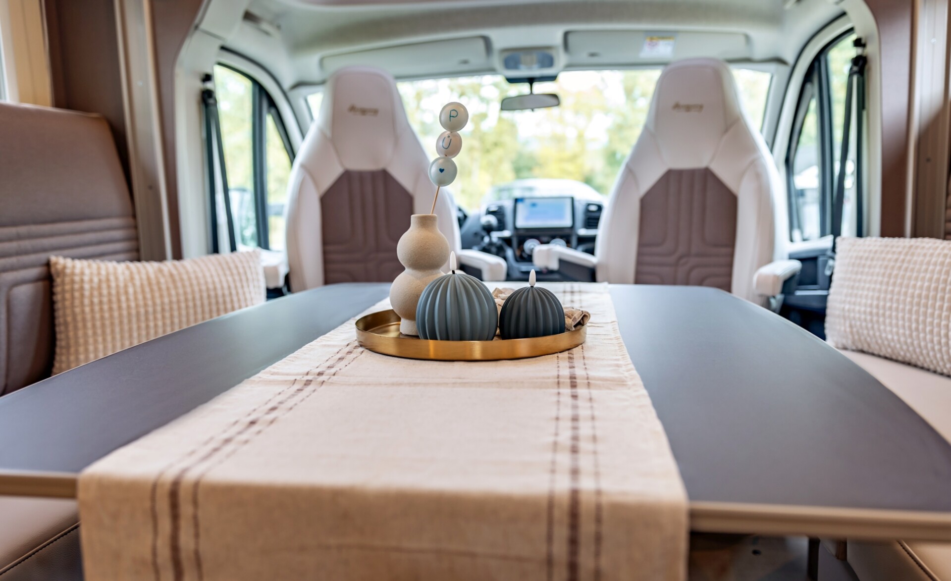 - Im „Wohnraum“ ist Platz, sodass sich hier zwei Menschen gut drehen und bewegen können. Auch die Nutzung eines Rollators ist hier möglich. Die Vordersitze sind drehbar und erweitern somit den Ess- und Sitzbereich. Zudem gibt es zwei gepolsterte Sitzbänke, diese können auch zum Ausruhen und sogar zum Liegen genutzt werden. Der Tisch ist höhenverstellbar und bietet hierdurch die Möglichkeit, diesen individuell auf die Bedarfe der Nutzer einzustellen.