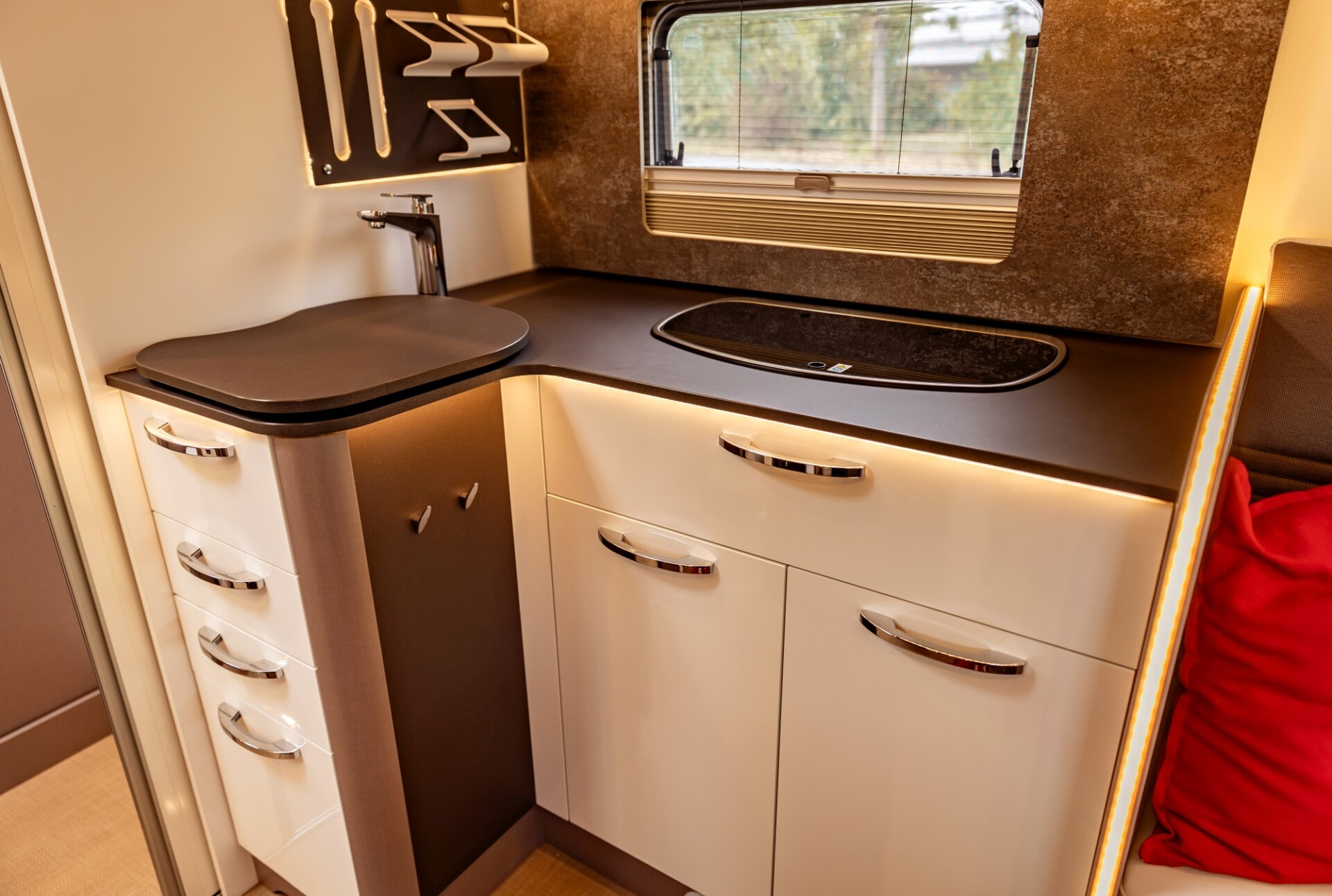 - Der Küchenbereich ist so gestaltet, dass notwendige Utensilien gut verstaut werden können und gut erreichbar sind.